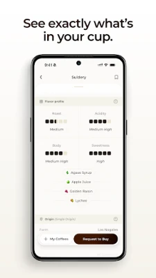 - Simply scan any coffee bag to reveal its flavor profile, roast level, origin, and more. No jargon — just clear, visual details you can grasp at a glance.