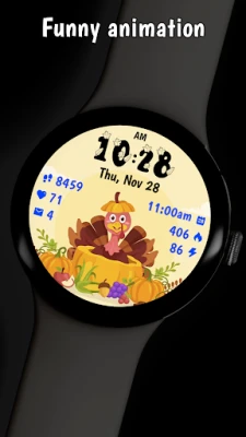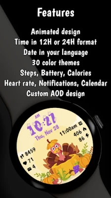 Transform your Wear OS watch into a charming harvest celebration with this adorable animated watch face featuring a friendly turkey and seasonal decorations! Perfect for autumn and Thanksgiving festivities! π